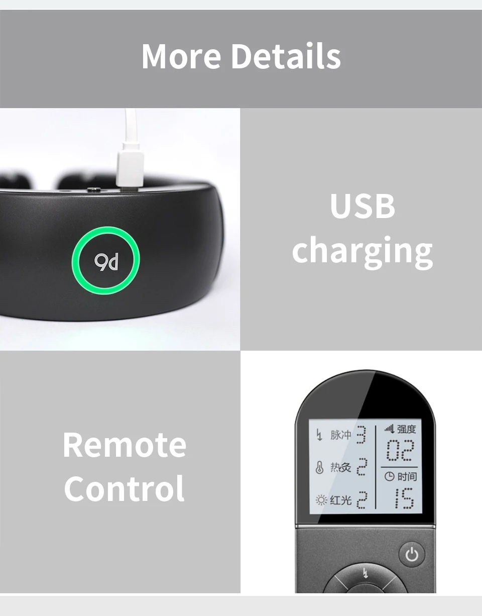 Drei Funktionen in einem Gerät: Wärme, niederfrequente elektrische Impulse und Vibration zur gezielten Linderung verspannter Nackenmuskulatur